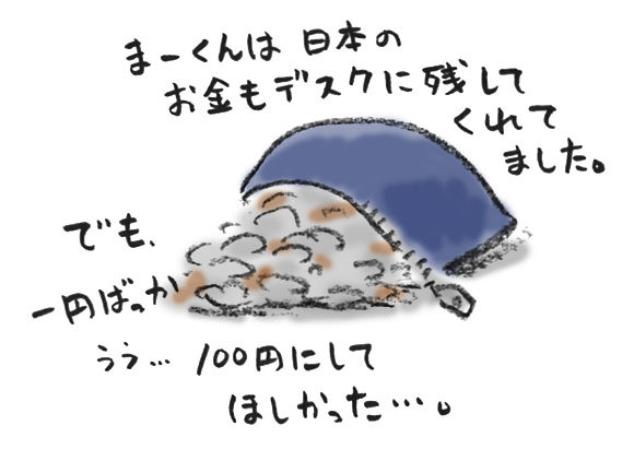 中身はまーくんの会社の片付けをした時に出てきた、どっかの外国のお金。