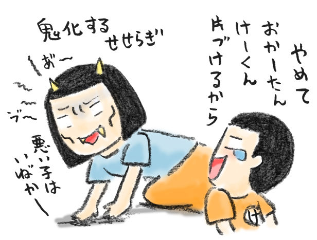 その時、けーくんもしーちゃんも鬼にビビり良い子に片付けを始めたんです。
